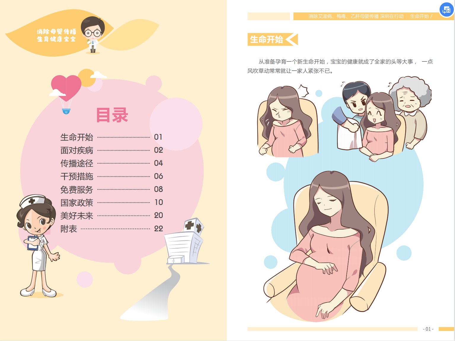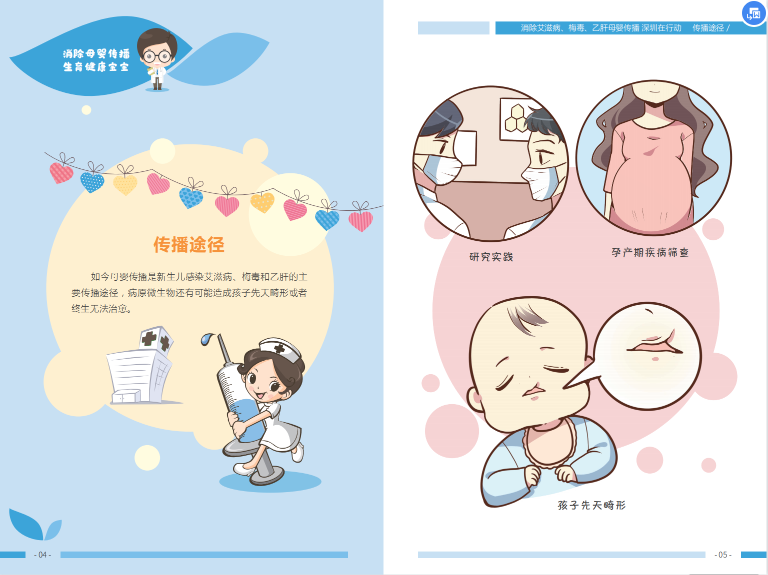 当准妈妈面对艾滋病、梅毒和乙肝这样可以通过母婴传播的疾病时,往往会不知所措。深圳市消除艾滋病、梅毒和乙肝母婴传播项目组制作了宣传页,帮助准妈妈们了解疾病,知晓疾病的传播途径,以及有哪些干预措施与服务。促进准妈妈们尽早进行孕前孕早期艾滋病、梅毒和乙肝检测,预防母婴传播。发现感染尽早干预,阻断母婴传播,让孩子拥有一个美好的未来。