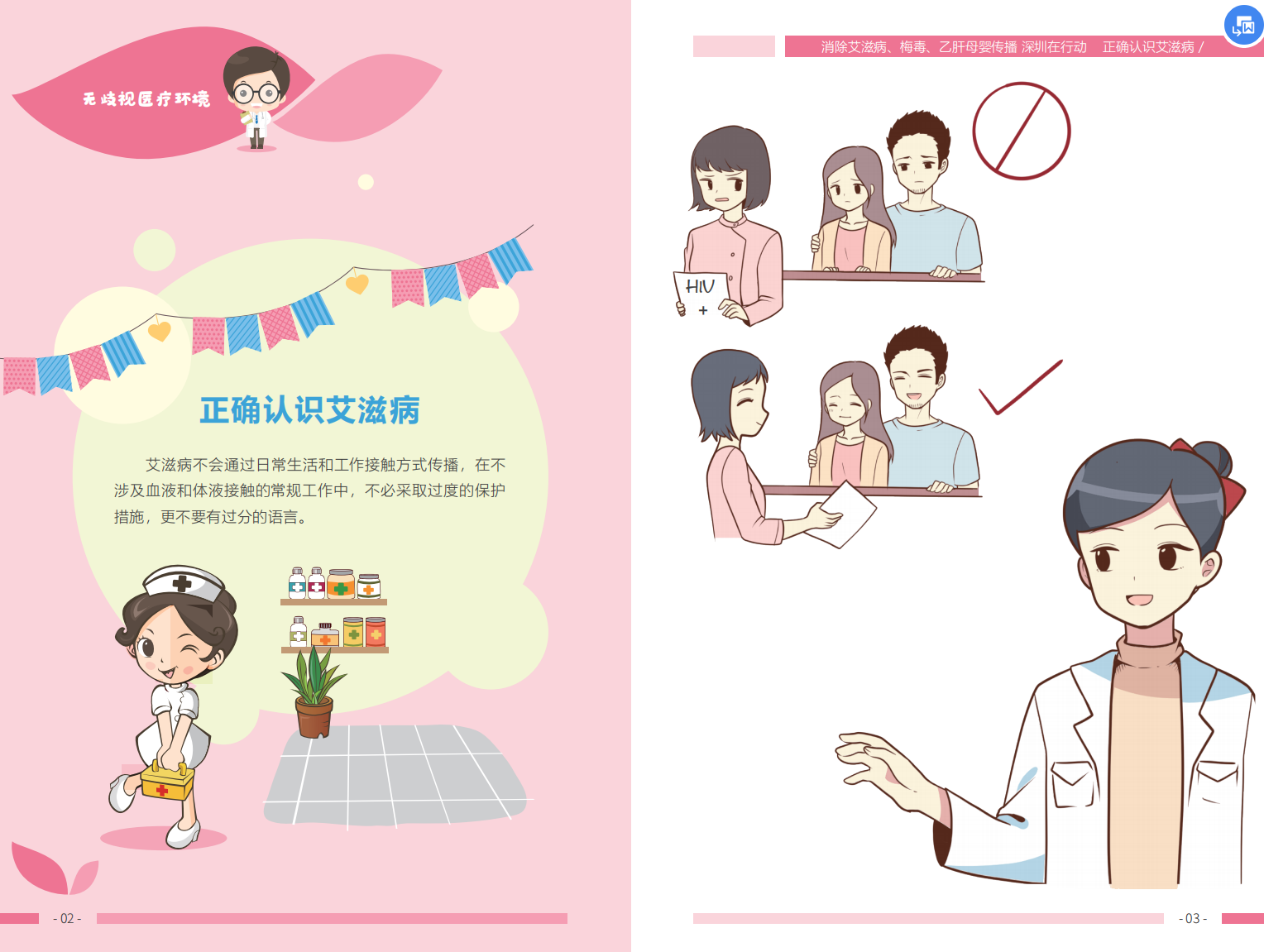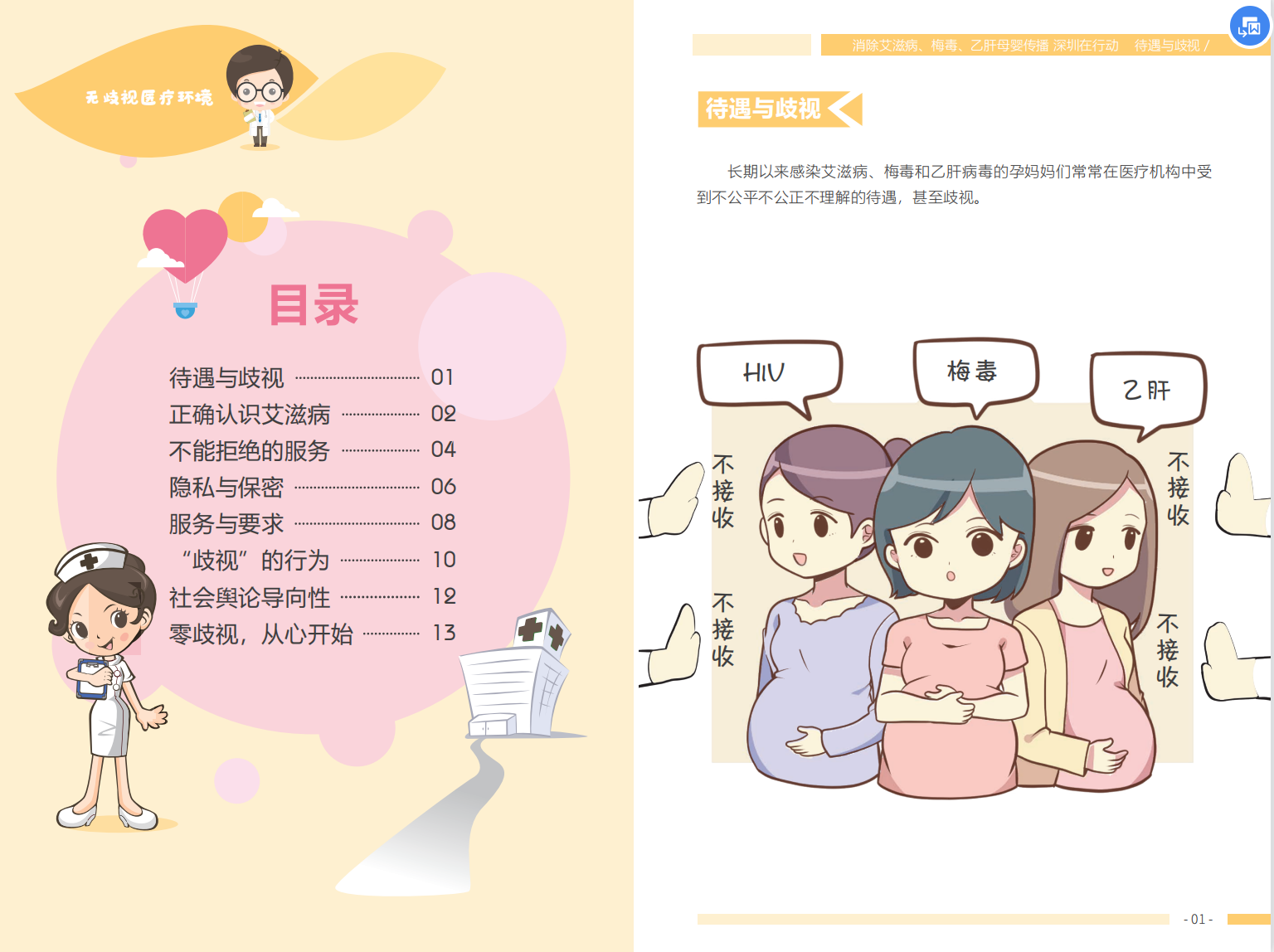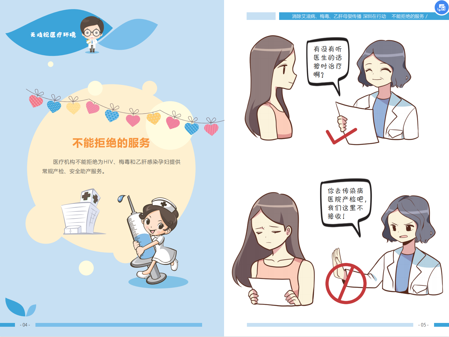 长期以来感染艾滋病、梅毒和乙肝病毒的孕妈妈们常在医疗机构中受到不公平不公正不理解的待遇,甚至歧视。深圳市消除艾滋病、梅毒和乙肝母婴传播项目组制作了宣传页,从感染孕妈妈们的待遇和歧视出发,科普正确认识艾滋病的态度,要求医务人员在工作中不能拒绝提供服务、注重隐私与保密等。通过宣传拒绝“歧视”行为,倡导零歧视,从心开始,同心协力,营造无歧视的医疗环境。