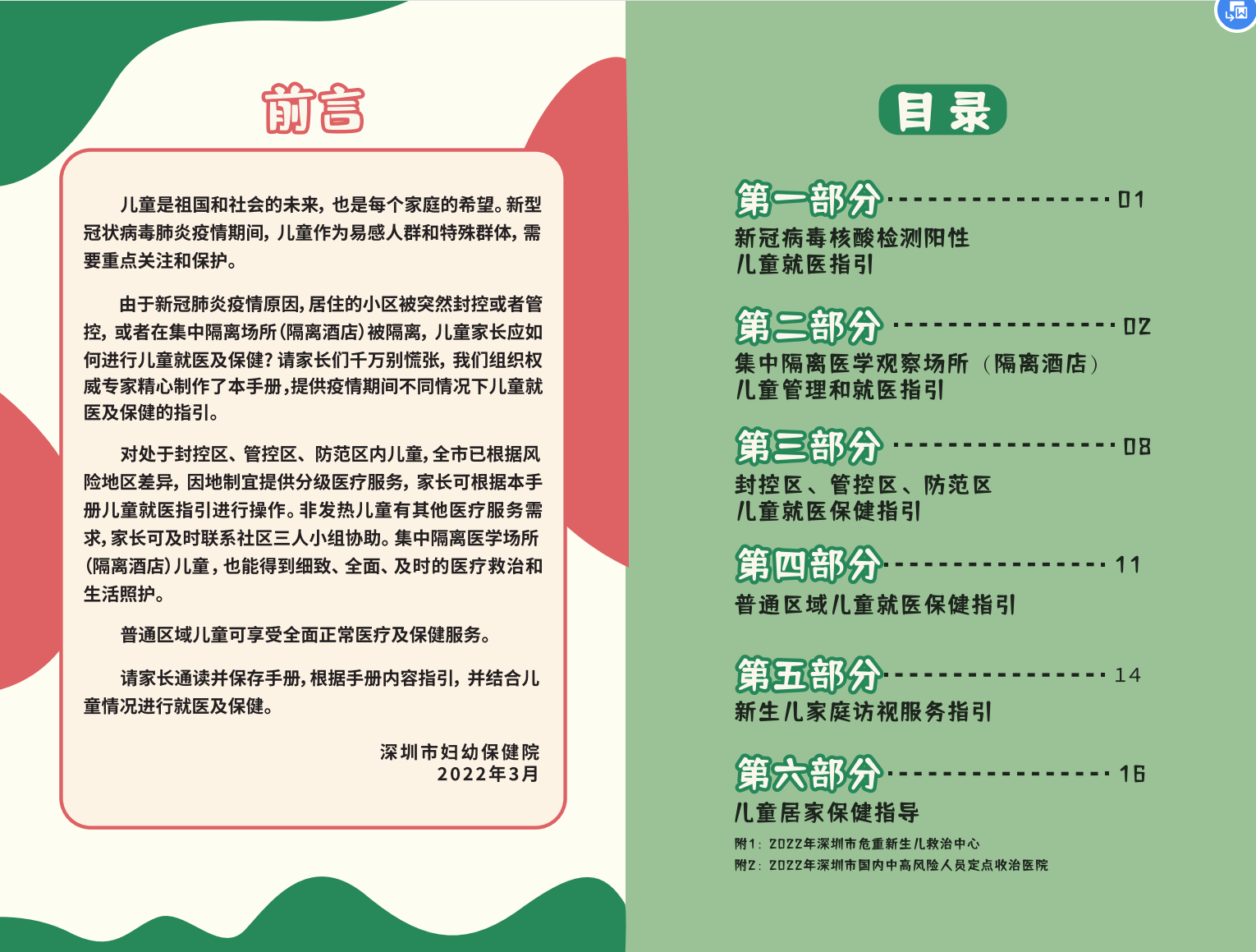 《新冠肺炎疫情期间儿童就医保健指引》详细介绍了新冠病毒核酸检测阳性儿童就医指引、集中隔离医学观察场所(隔离酒店)儿童的管理和就诊指引、封控区和管控区及防范区儿童的就医保健指引、普通区域儿童的就医保健指引、新生儿家庭访视服务指引及儿童居家保健指导等,为广大儿童在疫情期间的就医保健提供了一目了然的指导服务。