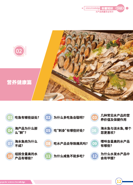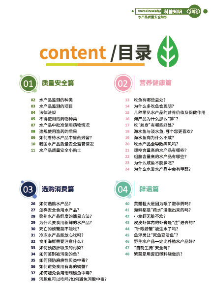 本科普小册主要针对水产品的质量安全、营养健康、辟谣和科学选购等几个模块开展科普知识的收集和整理,通过图文并茂的方式,针对市民生活中常见的水产品质量安全和消费问题等进行说明。对于市民了解水产品消费知识,提升科学素养具有重要参考意义。