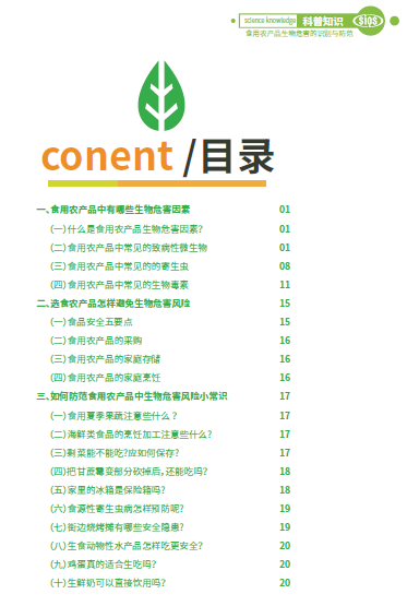 本科普小册主要涵盖了食用农产品中的生物危害种类、选食食用农产品怎样避免生物危害风险,如何防范食用农产品中的生物危害风险小常识等科普知识,通过图文并茂的方式,针对市民日常食用农产品消费中常见的生物危害问题进行说明。对于市民了解食用农产品生物危害、风险与防范等知识,提升科学素养具有重要参考意义。