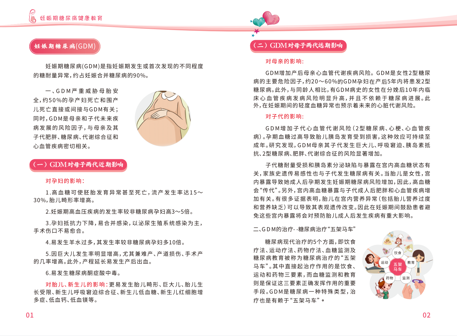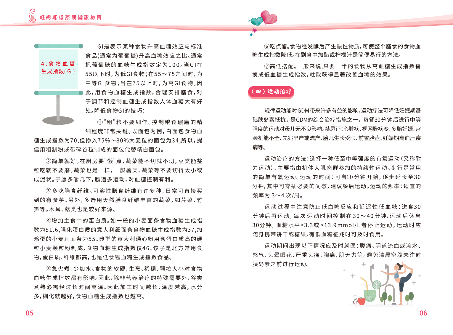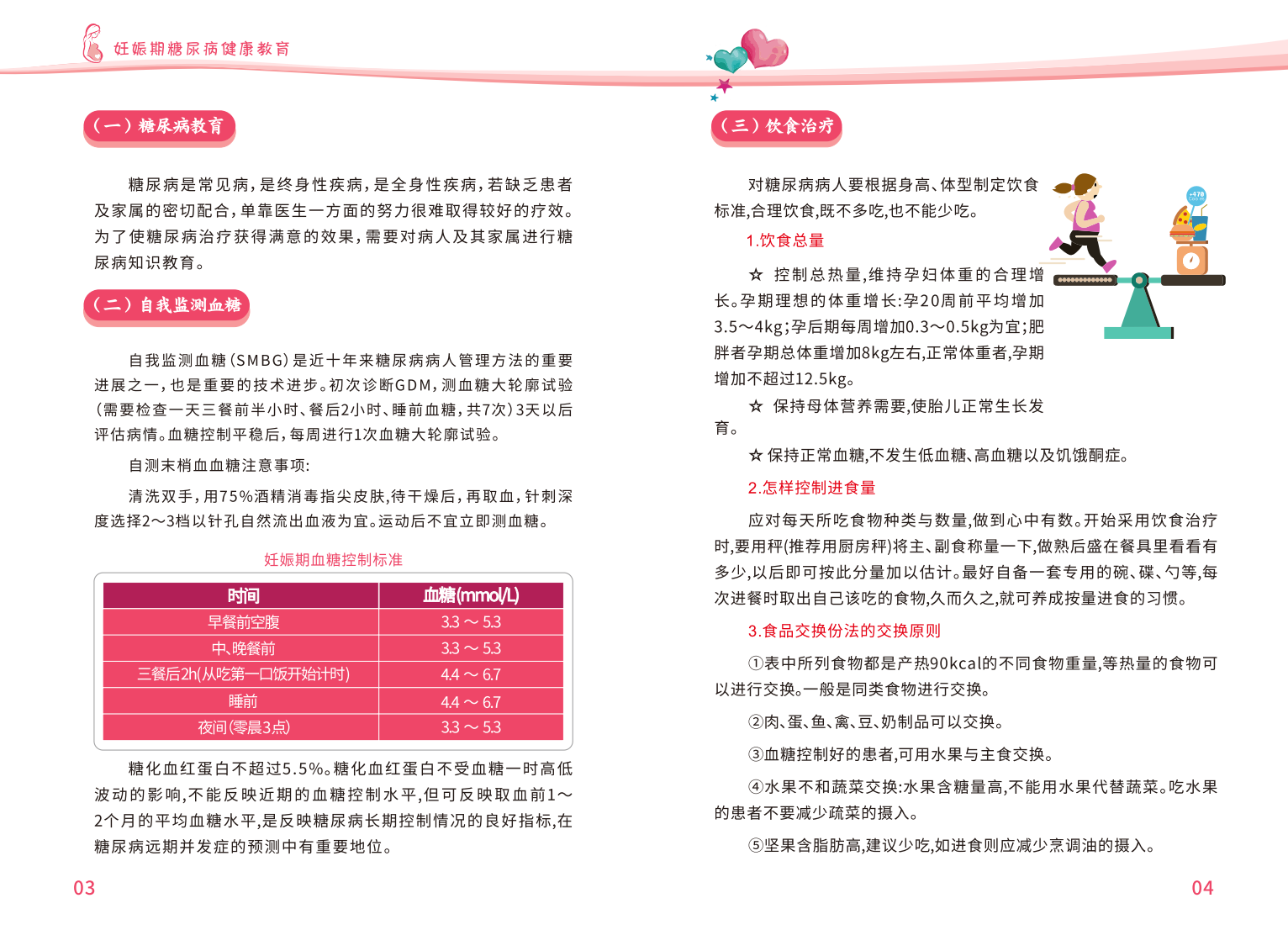 《妊娠期糖尿病健康教育手册》从妊娠糖尿病的概念及期对母婴的影响展开介绍,分别对自我血糖监测、饮食治疗、药物治疗、运动治疗等进行了详细的陈述科普,并附上了日常各类食物的热量表以供膳食参考。