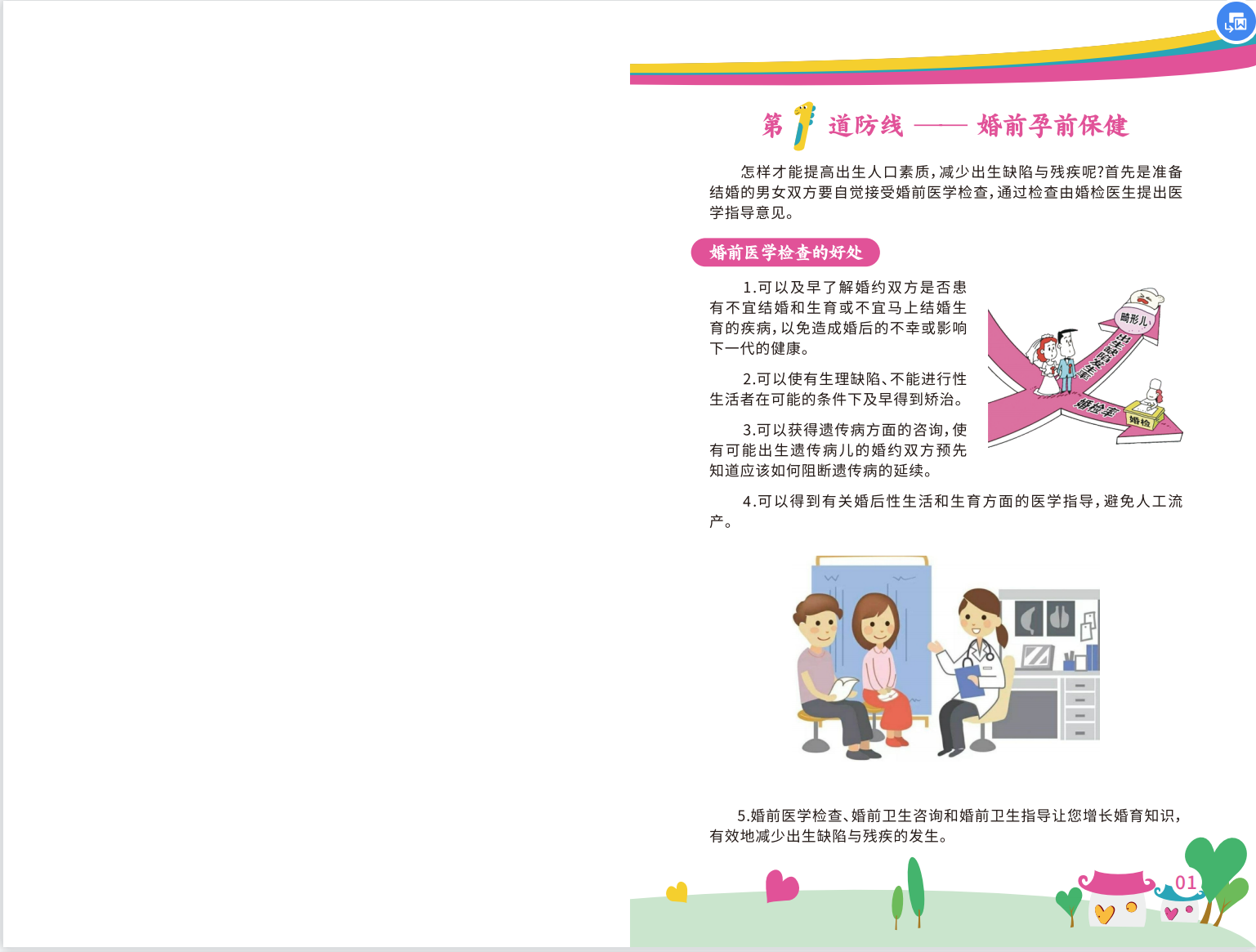 每个家庭都希望生育一个健康、活泼的孩子,但是,我国每年约有90万名先天性缺陷或残疾婴儿出生,给家庭和社会带来痛苦和负担。为了“提高出生人口素质,减少出生缺陷与残疾”, 该手册主要介绍如何通过自觉接受婚检、孕前保健,孕期保健、孕期检查、产前筛查和产前诊断,以及新生儿疾病筛查来减少缺陷儿和残疾儿的出生,做到早发现早治疗。