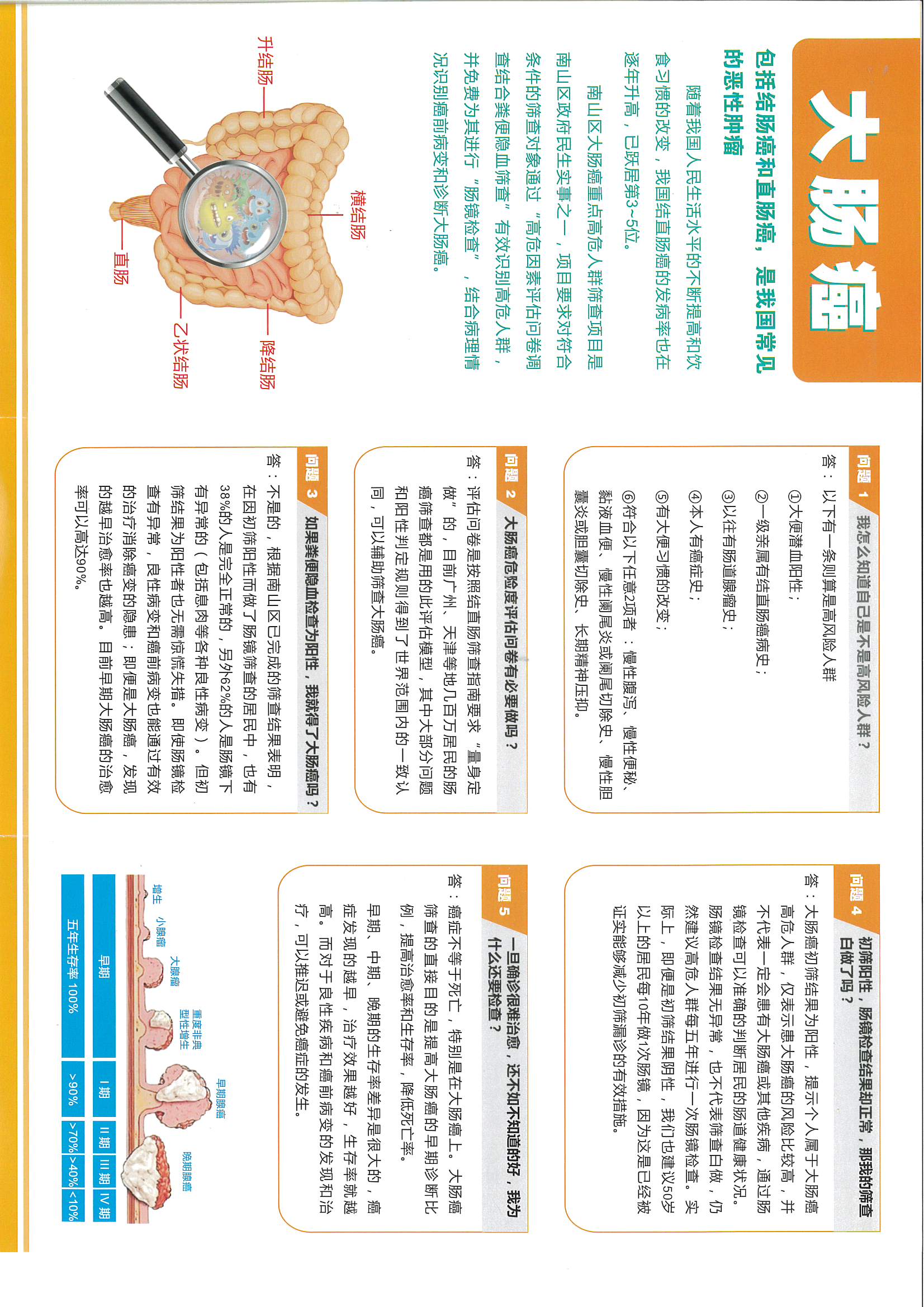 该作品形式为宣传折页,设计背景是南山区开展大肠癌筛查项目,设计初衷是让居民了解南山区大肠癌重点高危人群筛查项目。 随着我国人民生活水平的不断提高和饮食习惯的改变,我国结直肠癌的发病率也在逐年升高,已跃居第3~5位;南山区大肠癌重点高危人群筛查项目是南山区政府民生实事之一,项目要求对符合条件的筛查对象通过“高危因素评估问卷调查结合粪便隐血筛查”有效识别高危人群,并免费为其进行“肠镜检查”,结合病理情况识别癌前病变和诊断大肠癌。